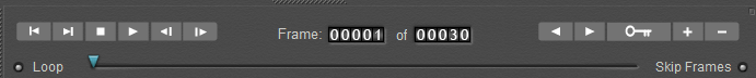 The Animation controls allow you to preview animations and set up keyframes. You do this by posing your figure, moving to a new frame, and changing the pose. Clicking the Play button plays an animation using the keyframes. The Animation controls appear as follows: