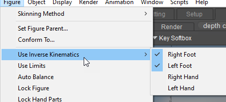 Poser supports IK for the arms and legs. With IK enabled, you can translate the hands and feet and achieve appropriate arm and leg positions automatically. IK creates targets to indicate the end of the chain. When the hands or feet move, the target is set to its new position. Moving any other body part keeps the target in its original position relative to the rest of the body. Once the target is reached, the end of the chain is fixed and the other parts must bend to accommodate the hand or foot position. For example, a foot reaches its target and the knee bends.