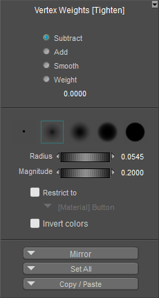- Weight: Use the Weight brush to paint with a specific weight value, as entered in the Weight field.