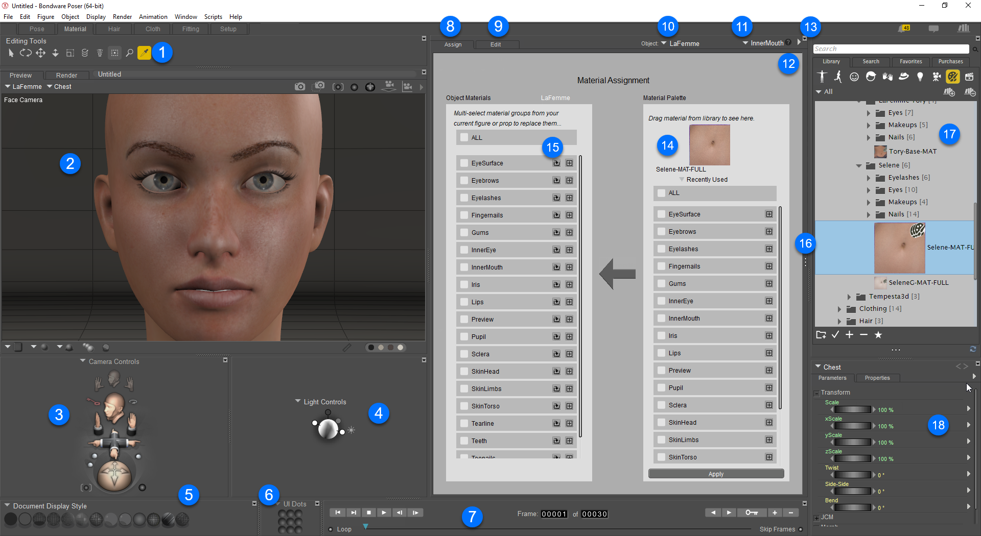 The Material room offers two options for working with surface materials: the Assign view and the Edit view tabs. By default, the Assign view of the Material room is displayed when you first start up Poser. This allows new users to get familiar with assigning Materials before diving into the Advanced settings of the Material room.