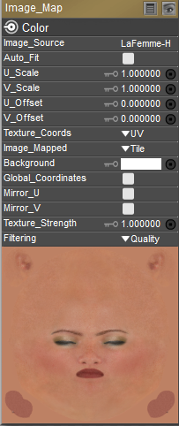 The Image Map node allows you to specify an image to use as a map (texture, reflection, transparency, bump, displacement, etc.). You can use any image as a map. However, if you want to use a map designed for the particular figure/prop, you must use an image that has been set up to work that way. PThis node has the following attributes: