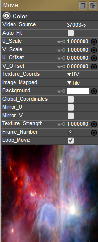 The Movie node allows you to add animations to materials. Supported formats are AVI, MPG, and WMV. This node has the following attributes: