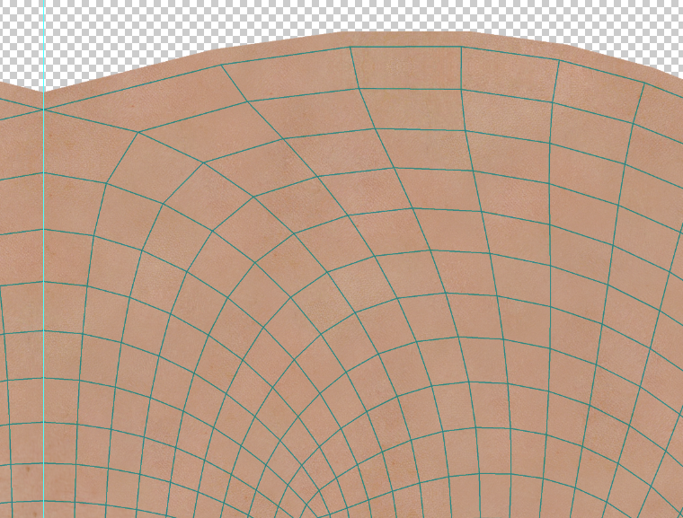 Usually a bleed of about 10-12 pixels for a 2K texture, and 20-25 pixels for a 4K texture will be sufficient enough to prevent visible seams at UV boundaries in most applications. An example of a bleed for a 4K head texture is shown in the following figure. The blue grid is the UV template for the head, and the actual head texture extends outward by 20 pixels in this example. Popular texturing programs such as Substance Painter and ZBrush allow you to configure the amount of bleed in their export settings.