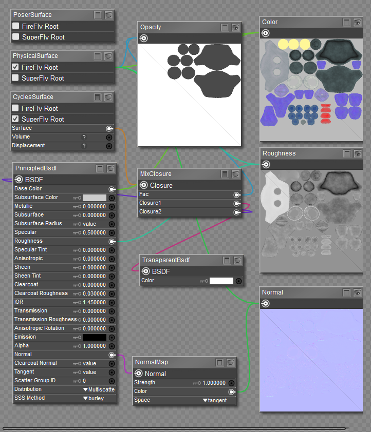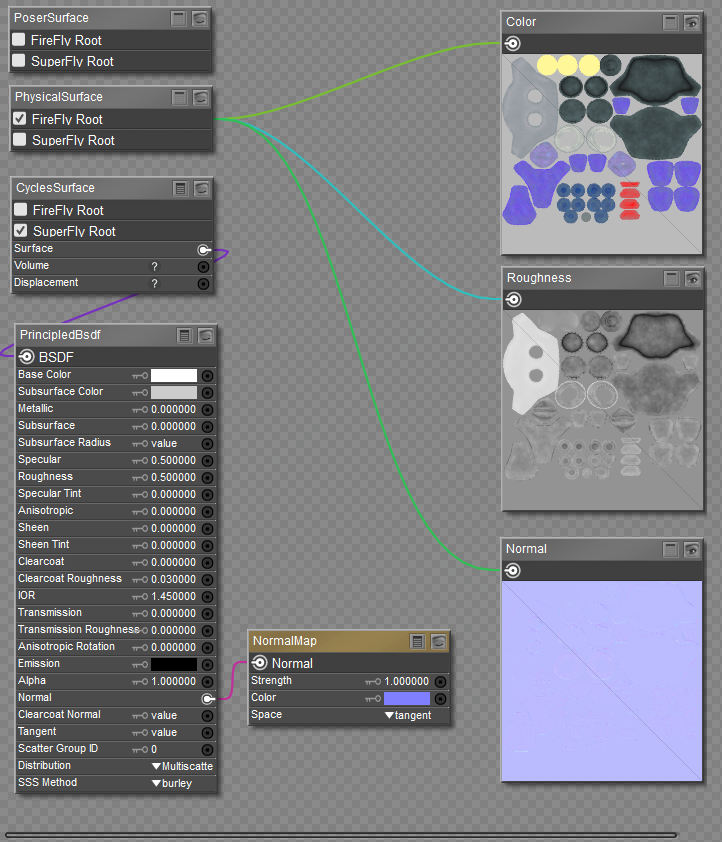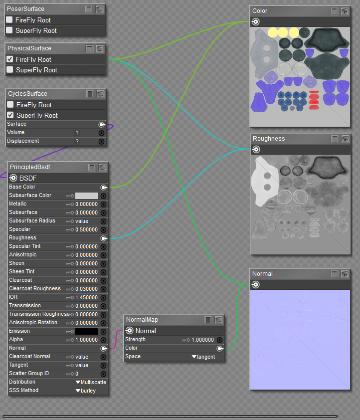 - Shift-click to select the CyclesSurface, PrincipledBsdf, and NormalMap nodes. Then right-click over one of the selected nodes and choose Copy.