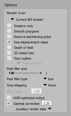 - Render Over: These options specify the background to be used when rendering images or movies. Check the appropriate radio button for the option you wish to select.