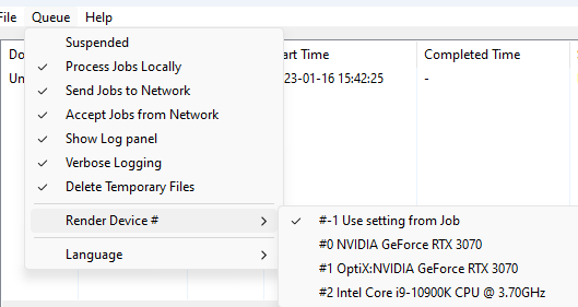 - Render Device: Displays a list of the available graphics adapters on your system. Select the device that you want the Queue Manager to use for rendering. If you choose Use setting from Job, the Queue will use the device that was selected in the Render Settings dialog.