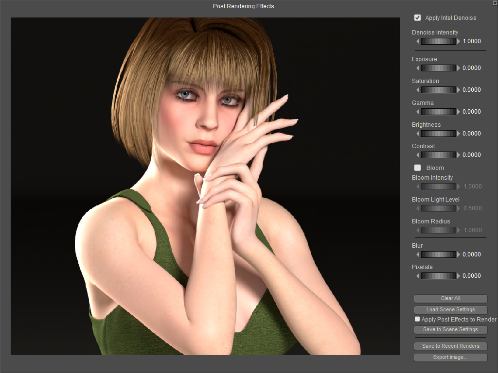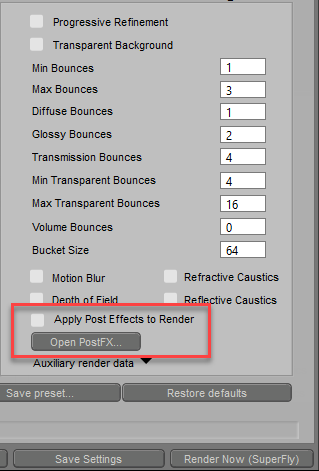 When you open the PostFX window from the Render Settings dialog, the following screen appears. This allows you to choose which post effects options and settings to use by default. The settings are described below.