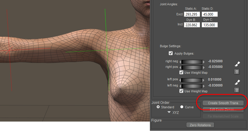 - By default, the adjacent body part blends with the selected part by default. To add other parts for blending, click the Edit Smooth Trans button in the joint editor palette to open the Select Objects hierarchy list. Use this list to choose the body parts that will blend with the selected actor. For example, if you have selected the right collar of a figure, it will blend with the right shoulder.