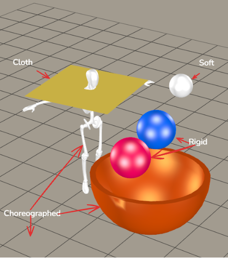Choreographed objects are those which either remain stationary or are animated manually with keyframes. When assigning choreographed objects, you only need to assign the objects that you expect the other physics objects to collide with.