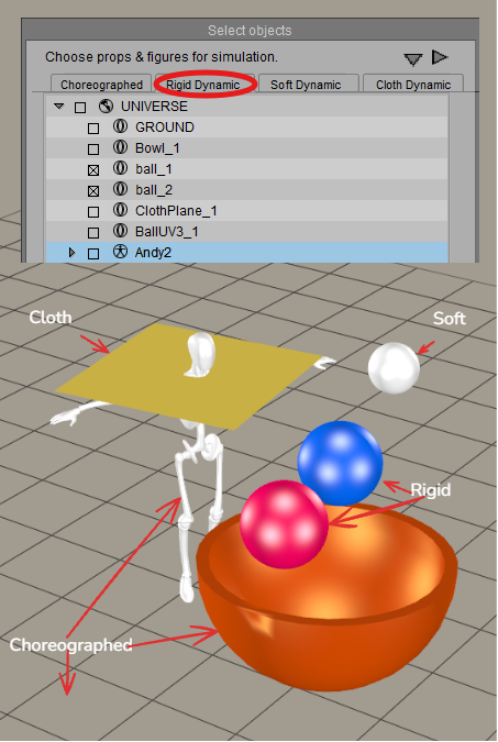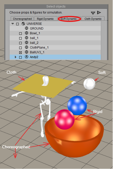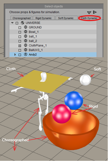 A simple example is shown in the figure that follows. There are seven objects in the scene: the ground, a bowl, two balls, a soft-body ball, the Andy manikin, and a cloth plane. Only three objects in the scene are assigned as choreographed objects: the ground, the Andy manikin, and the bowl in the center. These three items will not move, and the other objects in the scene can collide against them. Note that Poser figure hierarchies can be expanded and body parts can be included individually in the simulation.