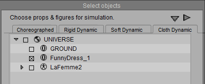 The Select Objects dialog displays four tabs: Choreographed, Rigid Dynamic, Soft Dynamic, and Cloth Dynamic. As you switch from one tab to the next, you place a check beside each of the objects in your scene that you want to designate as that object type.