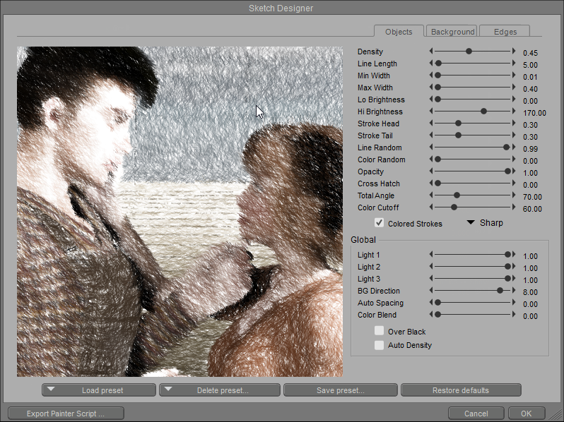 Clicking the Export Painter Script button in the lower left corner of the Sketch Designer exports the current Sketch Designer settings to Corel Painter. This has been tested to work with Painter 6 and previous versions, and is not supported for later versions though it may work with them.